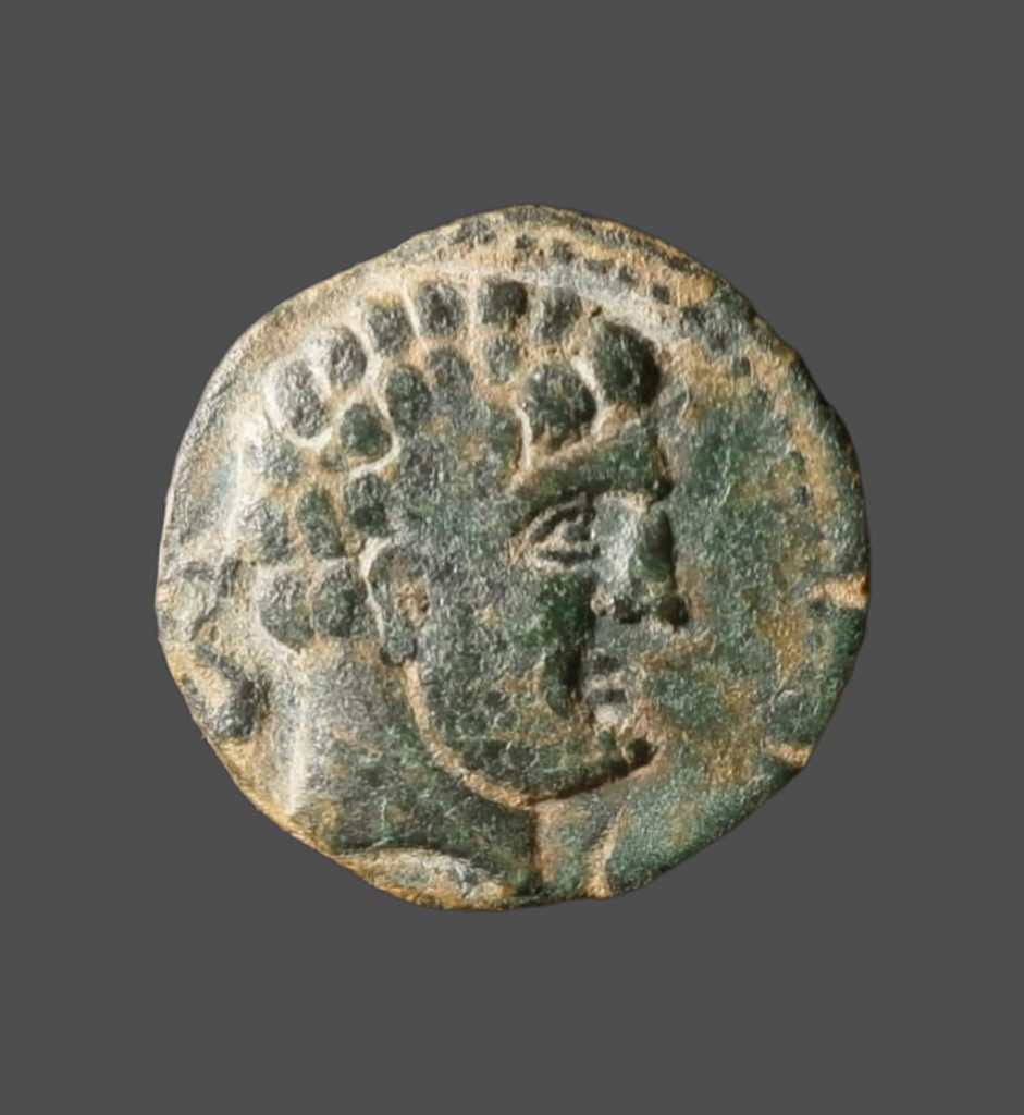 Anv.: Busto masculino barbado a derecha, detrás delfín.