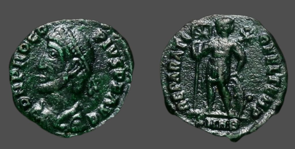 Rev.: Emperador de pie de frente, cabeza a la derecha, con lábaro y escudo, cristograma arriba, objeto no identificado abajo (una seta?).