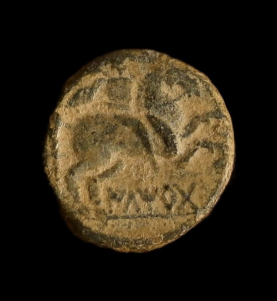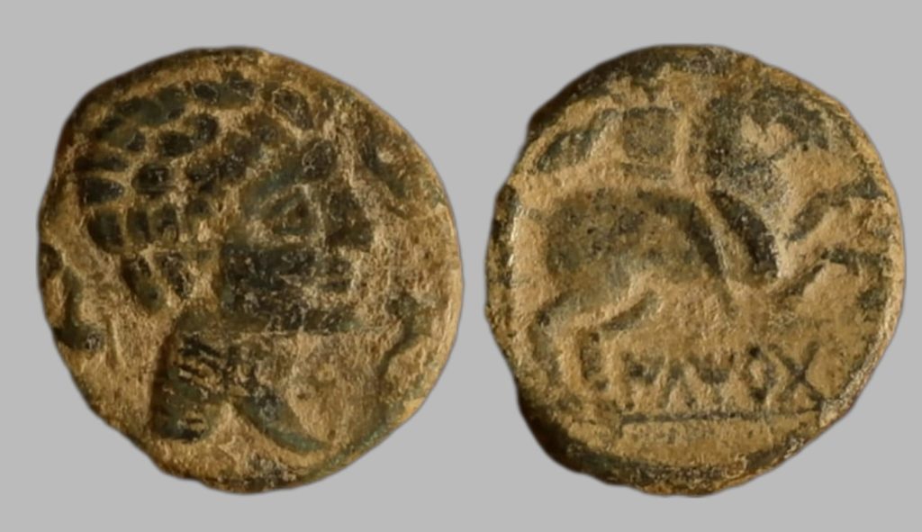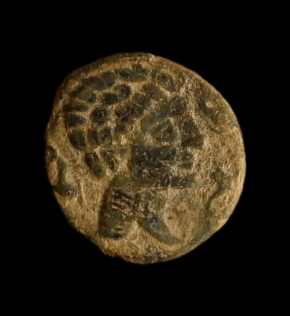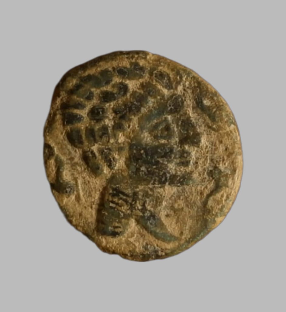 Anv.: cabeza masculina a derecha, con manto y dos fibulas.