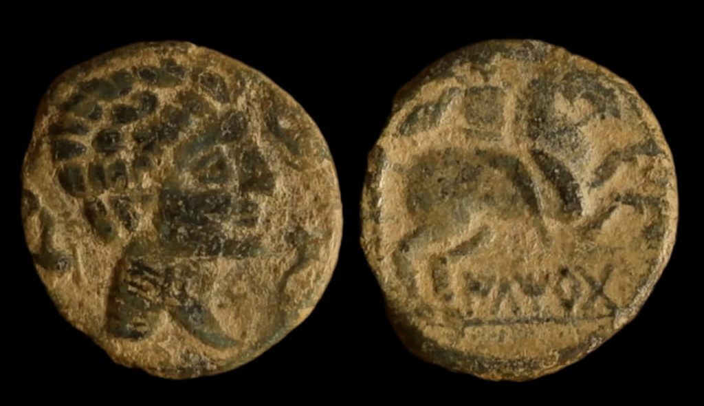R/ Jinete con palma y clámide, debajo, ley. ibérica: ILTIRTA.