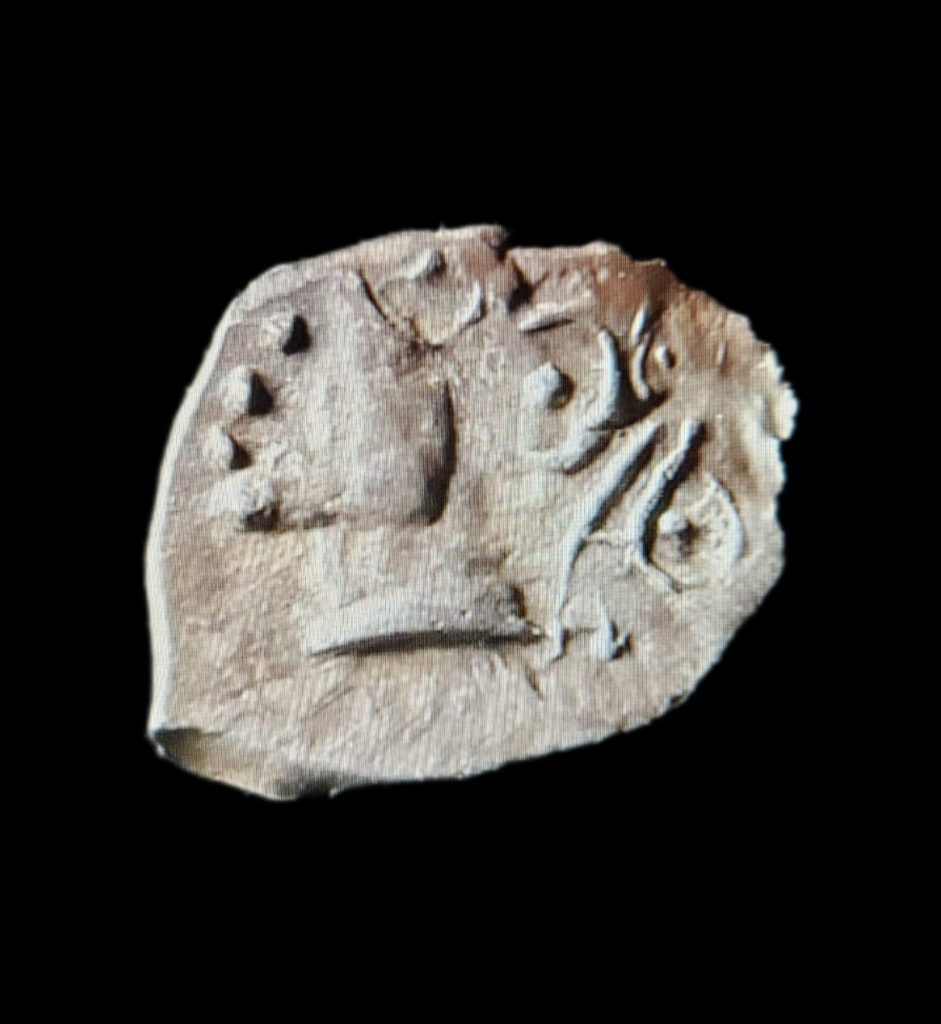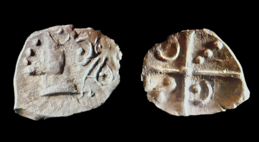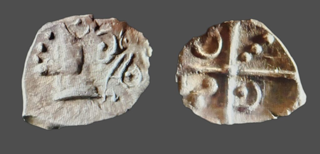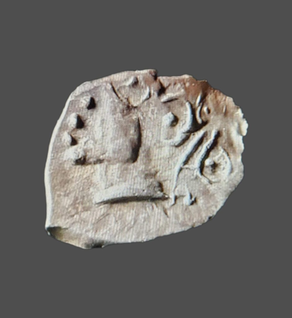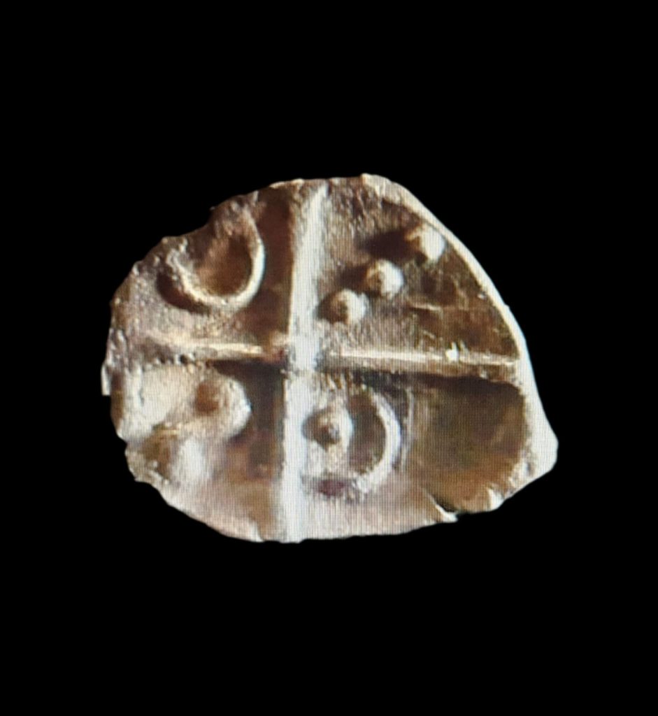 Rev.: Cruz con punto en el centro, formada por cuatro radios: un punto rematado por una lúnula en el 1er cantón, un esse en el 2º cantón, tres puntos unidos al 3er cantón y un punto dentro de creciente y un creciente en el 4º. (La foto del reverso esta girada 180 grados).