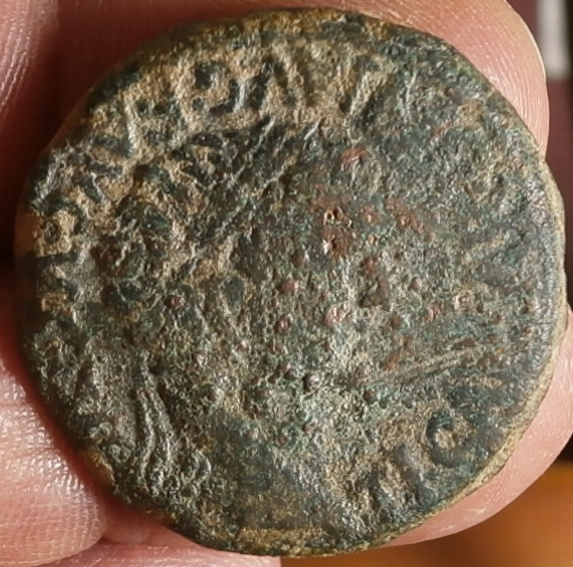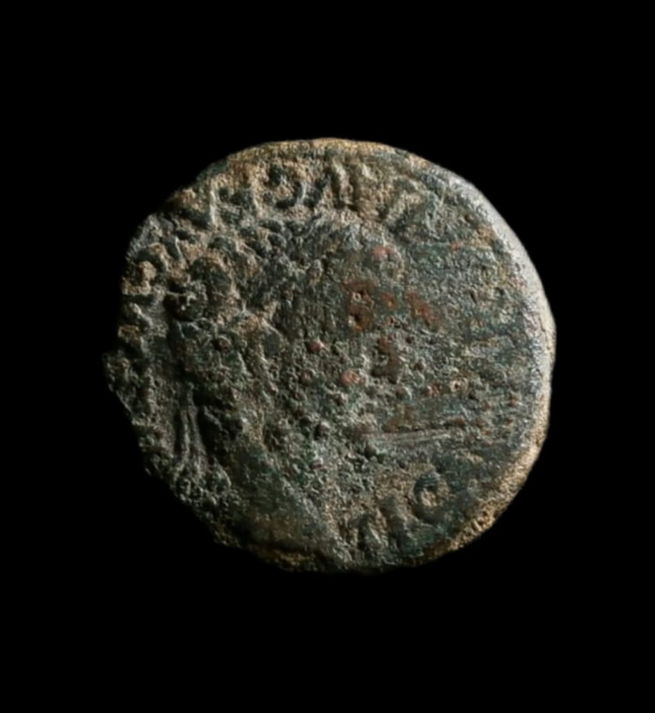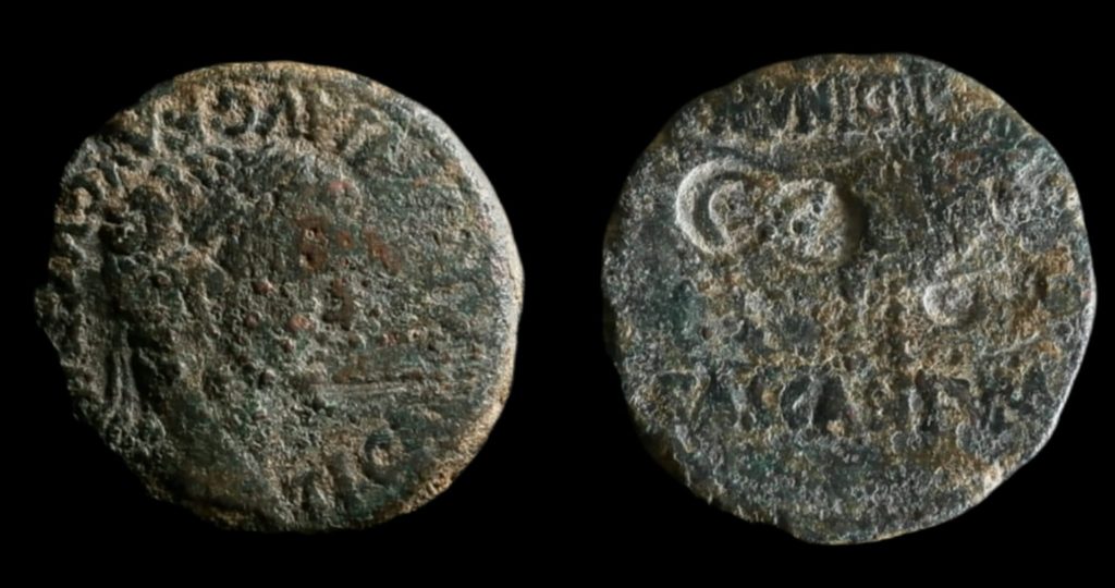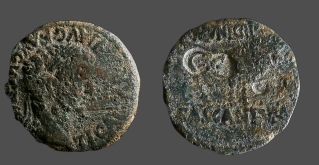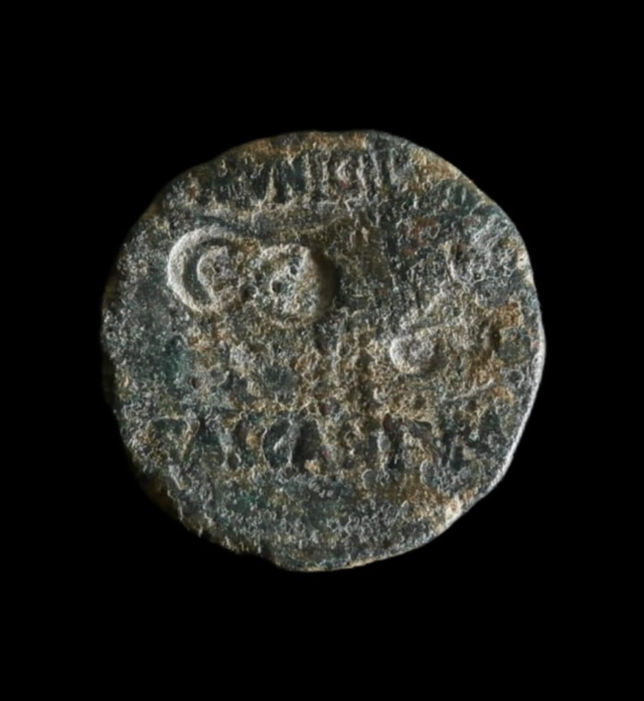 As de CASCANTUM, CASCANTE (NAVARRA). Resellos C,C (con punto central) y otro «c» pequeño dentro de un cuarto resello en reverso sobre as de Tiberio 14-37 d.C.