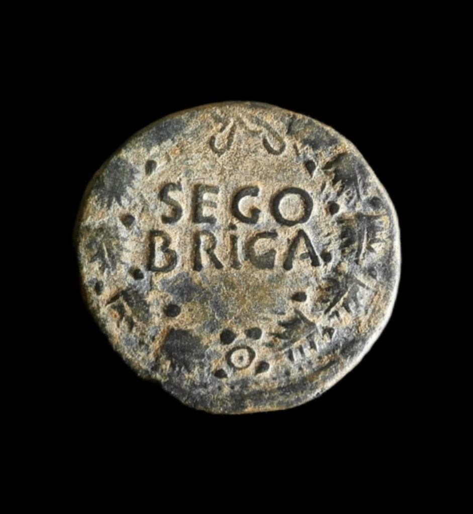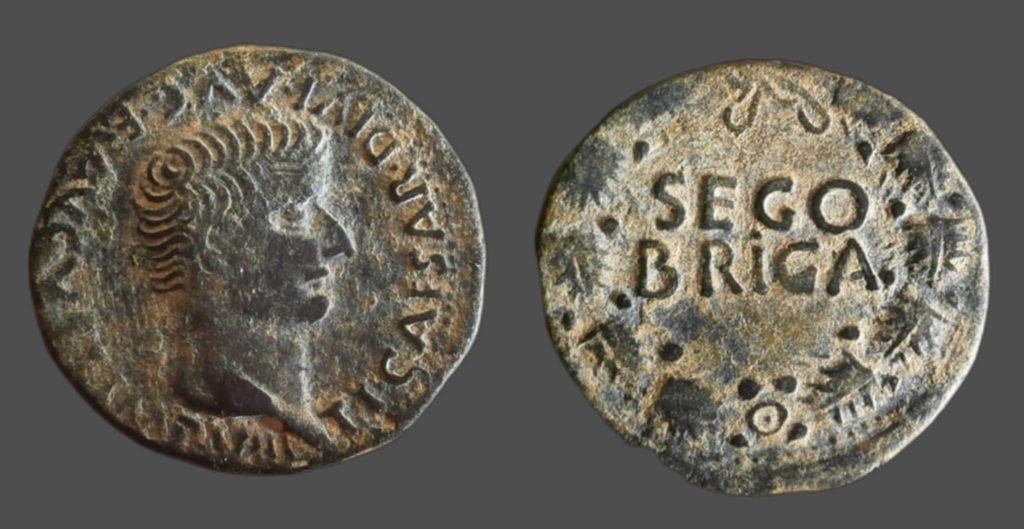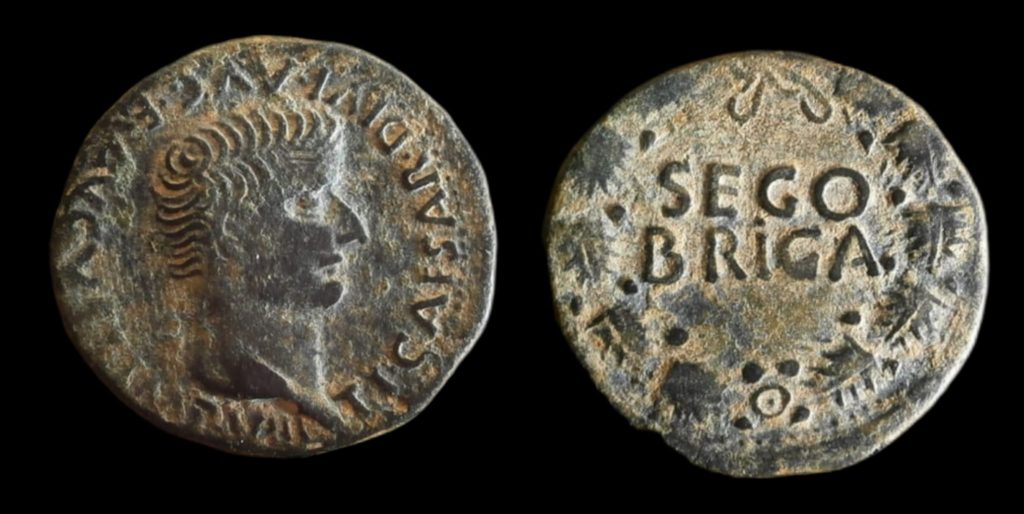 Anv.: Cabeza desnuda de Tiberio a derecha, alrededor de TI. CÉSAR. DIVI. PROMEDIO. E AVGVS. F.IMP. VIII. Rev.: Láurea, dentro leyenda latina SEGOBRIGA. .
