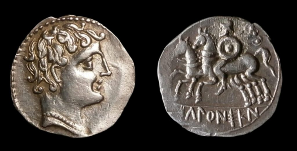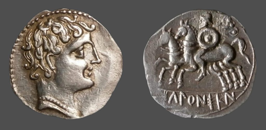 Rev.: Jinete con rodela y clámide al aire, a izquierda, llevando un segundo caballo, debajo leyenda ibérica IKALKUNSKEN.