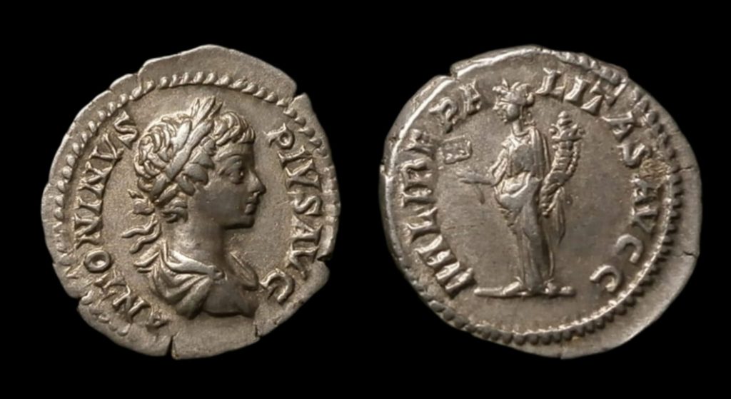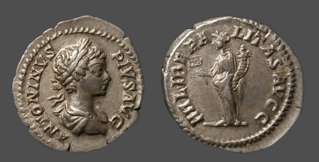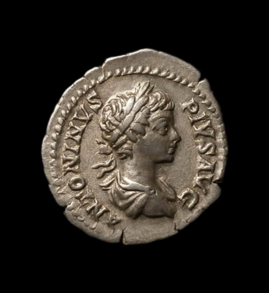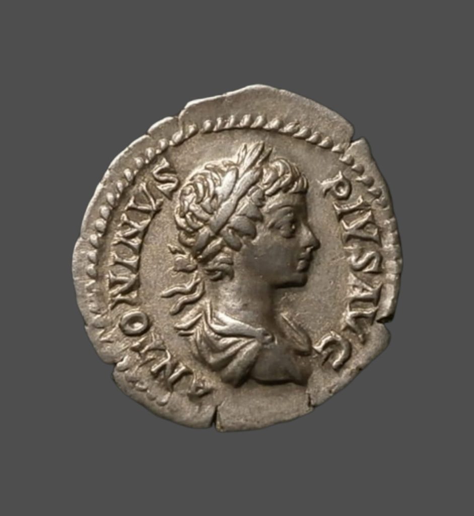 Anv.: ANTONINVS PIVS AVG Busto laureado y drapeado de Caracalla mirando a la derecha.