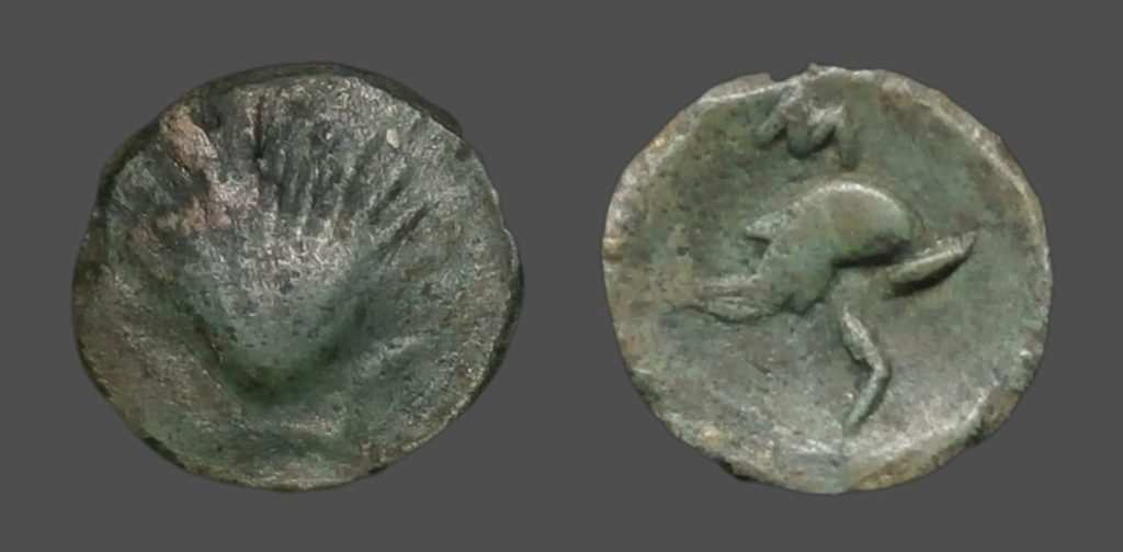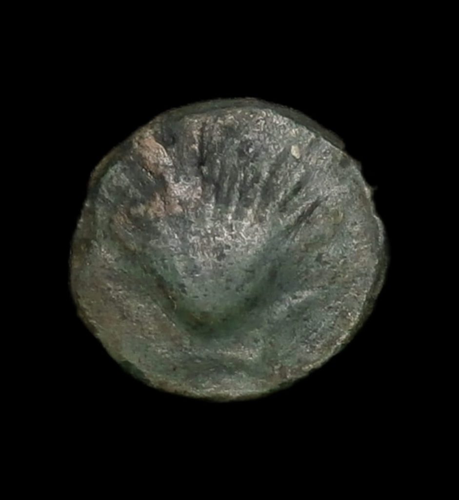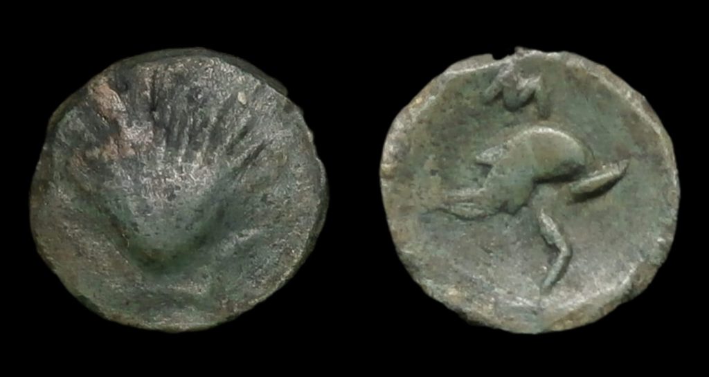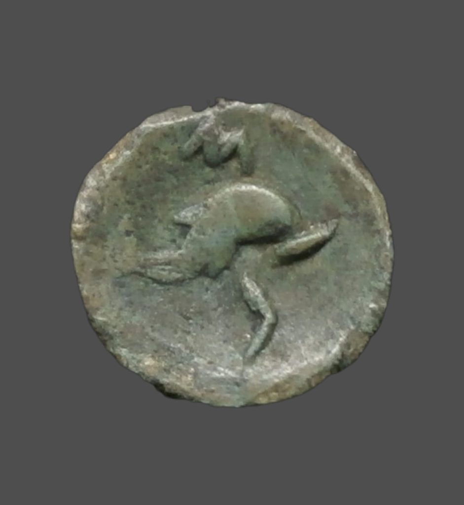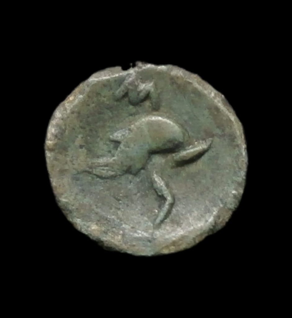 Rev: Delfín a derecha, encima letra ibérica: S, debajo K invertida.