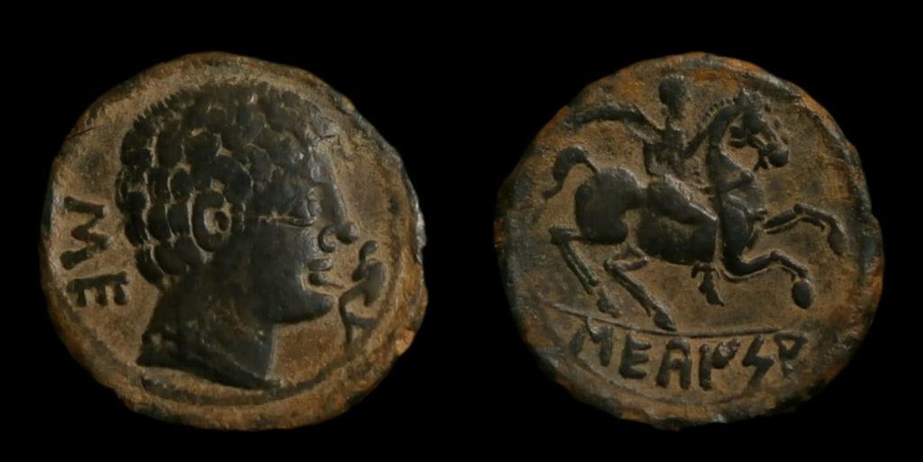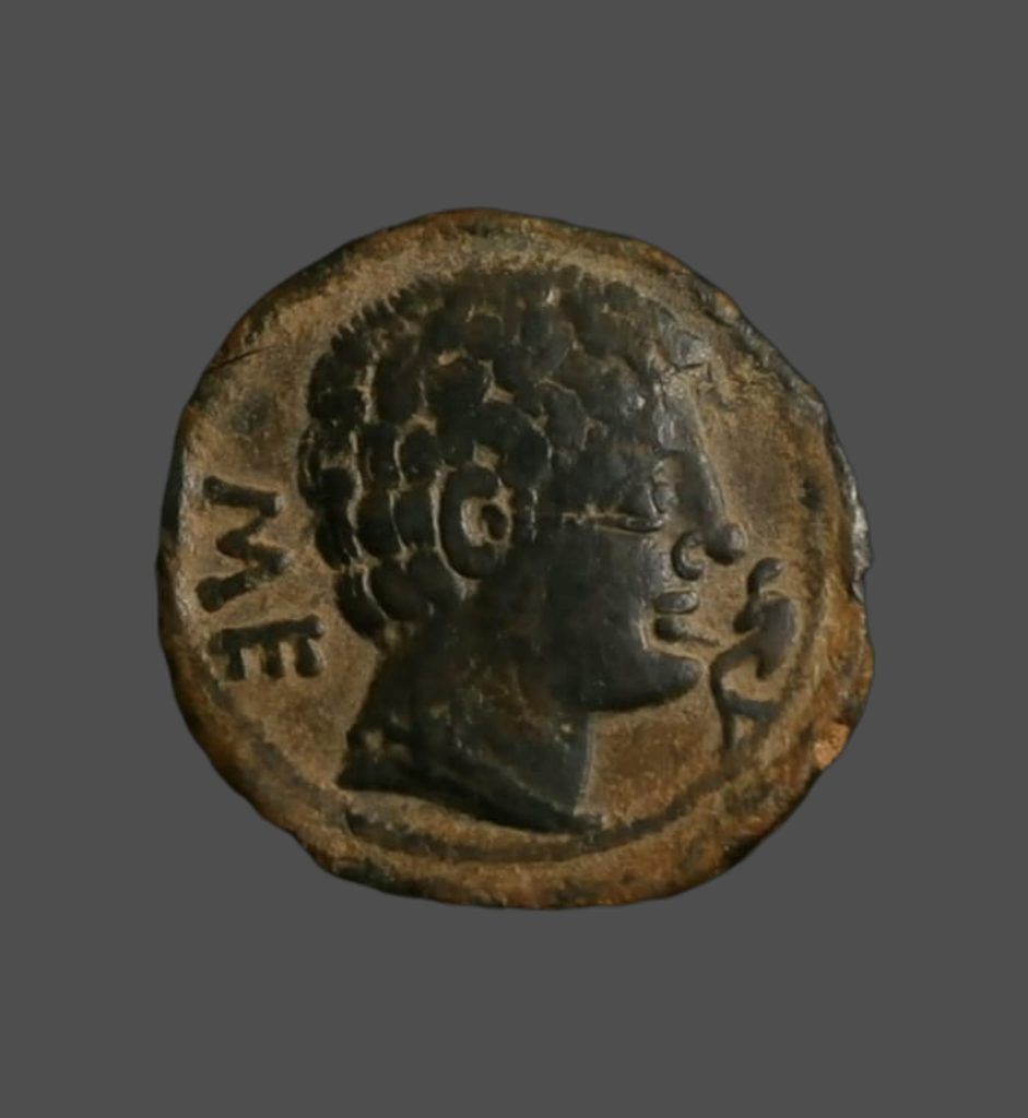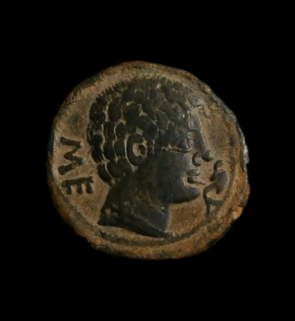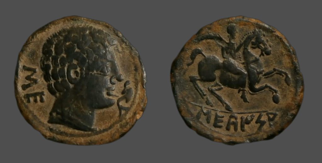 Anv.: Cabeza masculina a derecha, delante delfín, detrás letras ibericas «SE».