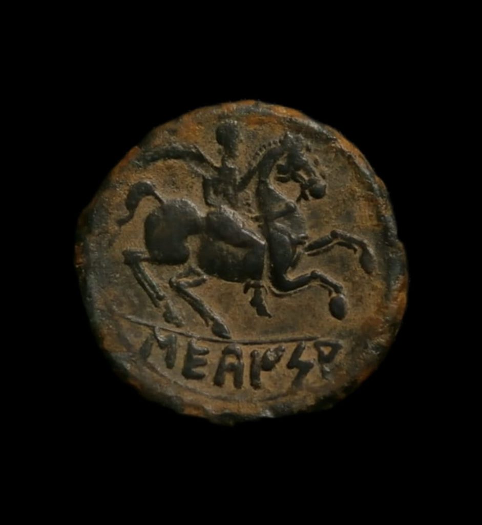 Rev.: Jinete con palma a derecha, leyenda ibérica bajo «SEKAISA».