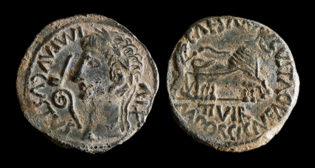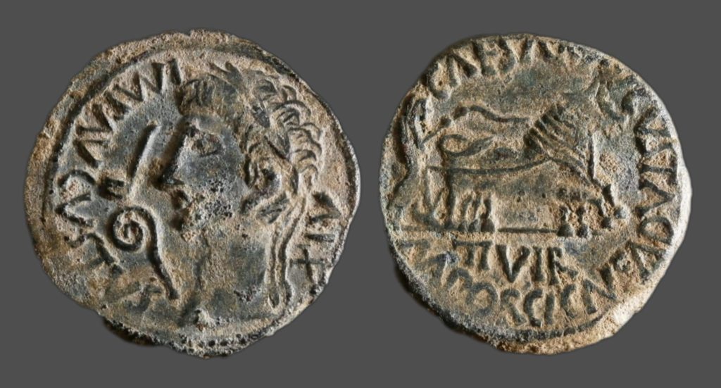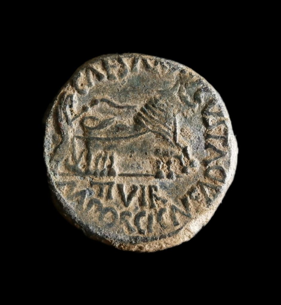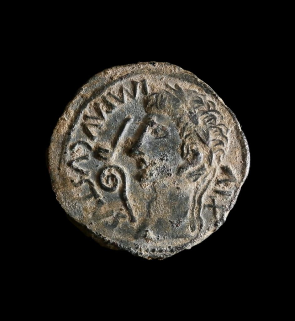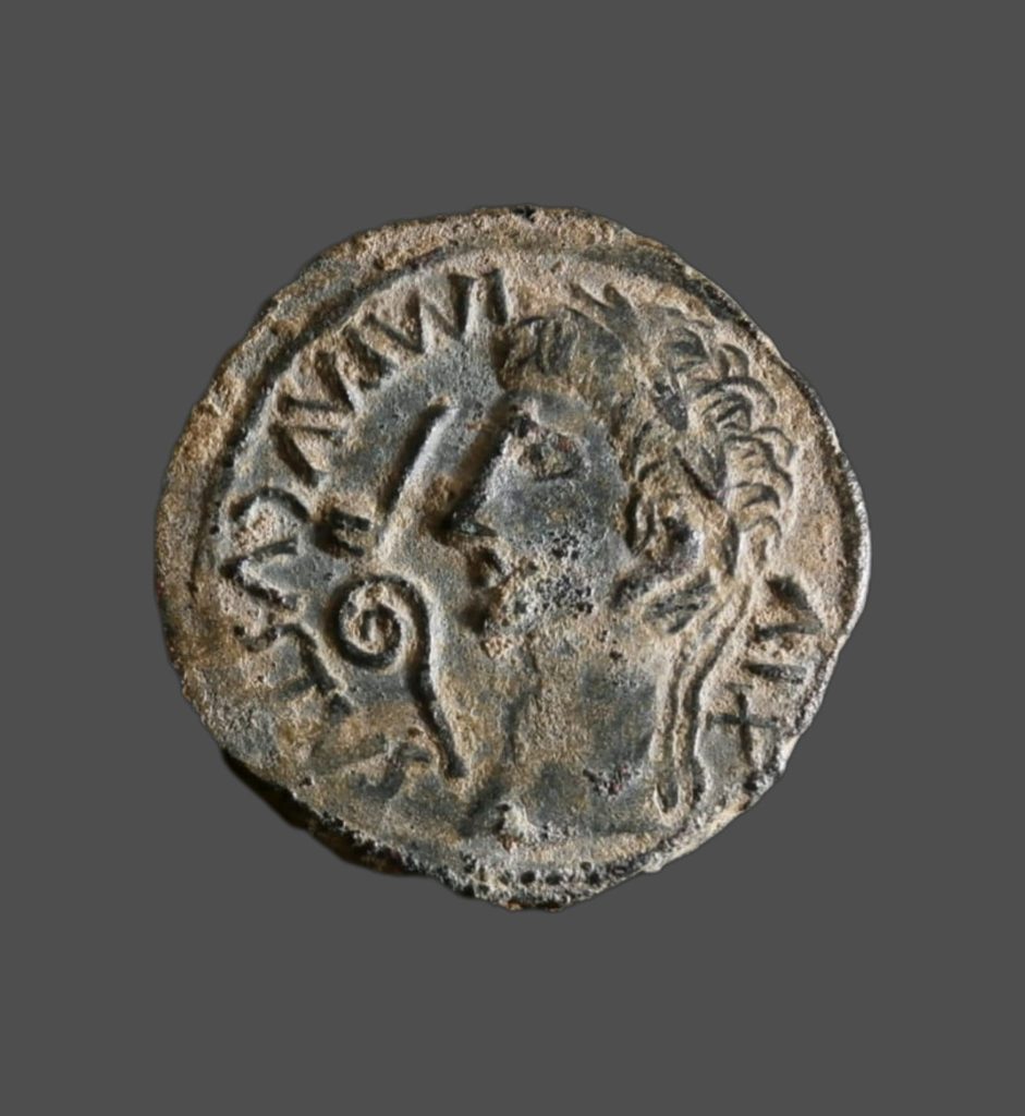 A.: Cabeza de Vulcano a derecha. con gorro cónico. Detrás leyenda neopúnica MLK’.